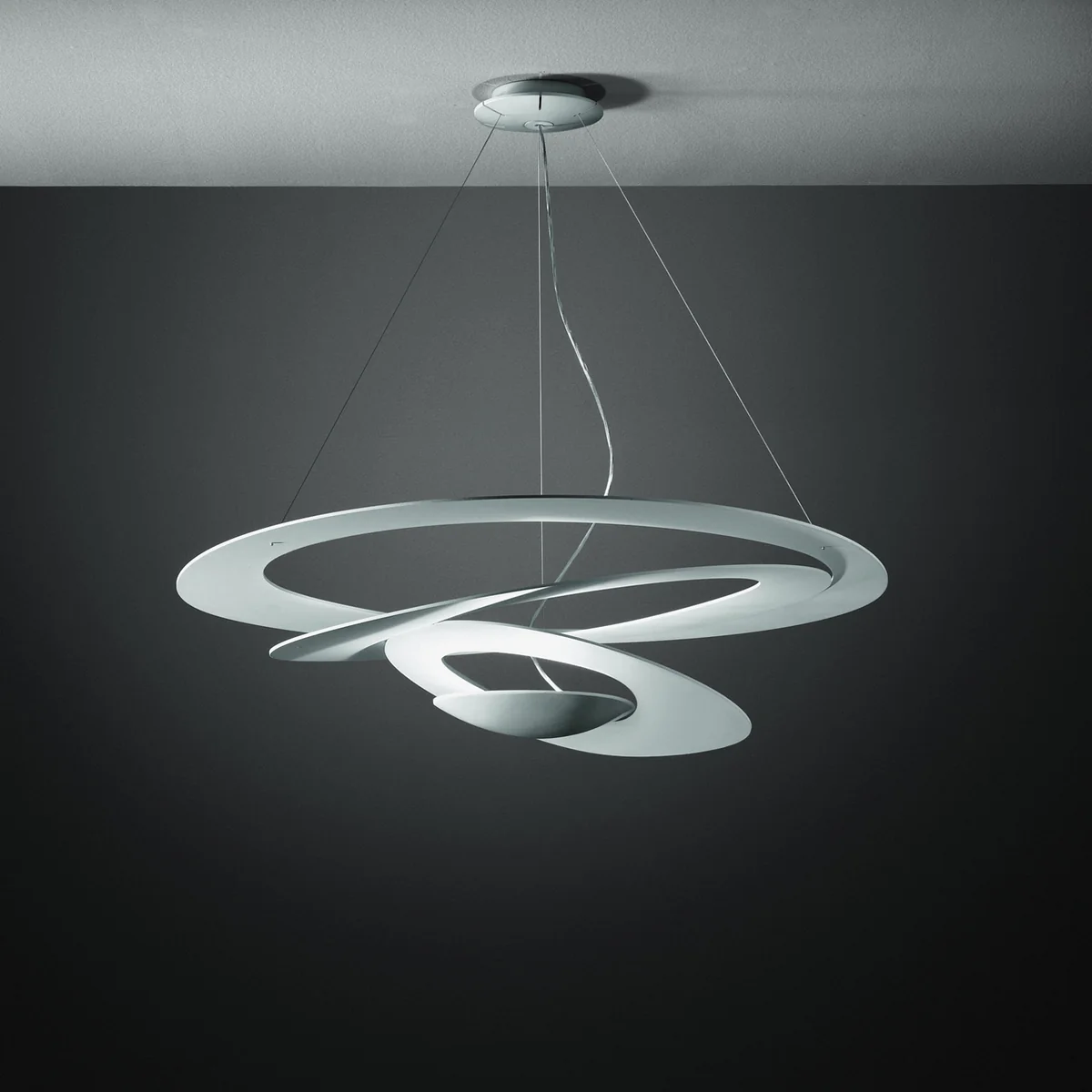 Die Pirce Sospensione wurde von Giuseppe Maurizio Scutellà für den italienischen Leuchtenhersteller Artemide entworfen. Das Design von Pirce wirkt wie das Ergebnis eines Scherenschnitts: Die feine Scheibe geht in sanft geschwungene Ringe über, die sich spiralförmig nach unten neigen. Je nachdem, wie lang die Aufhängung gelassen wird, wird die Silhouette der Pierce flacher oder länglicher.
